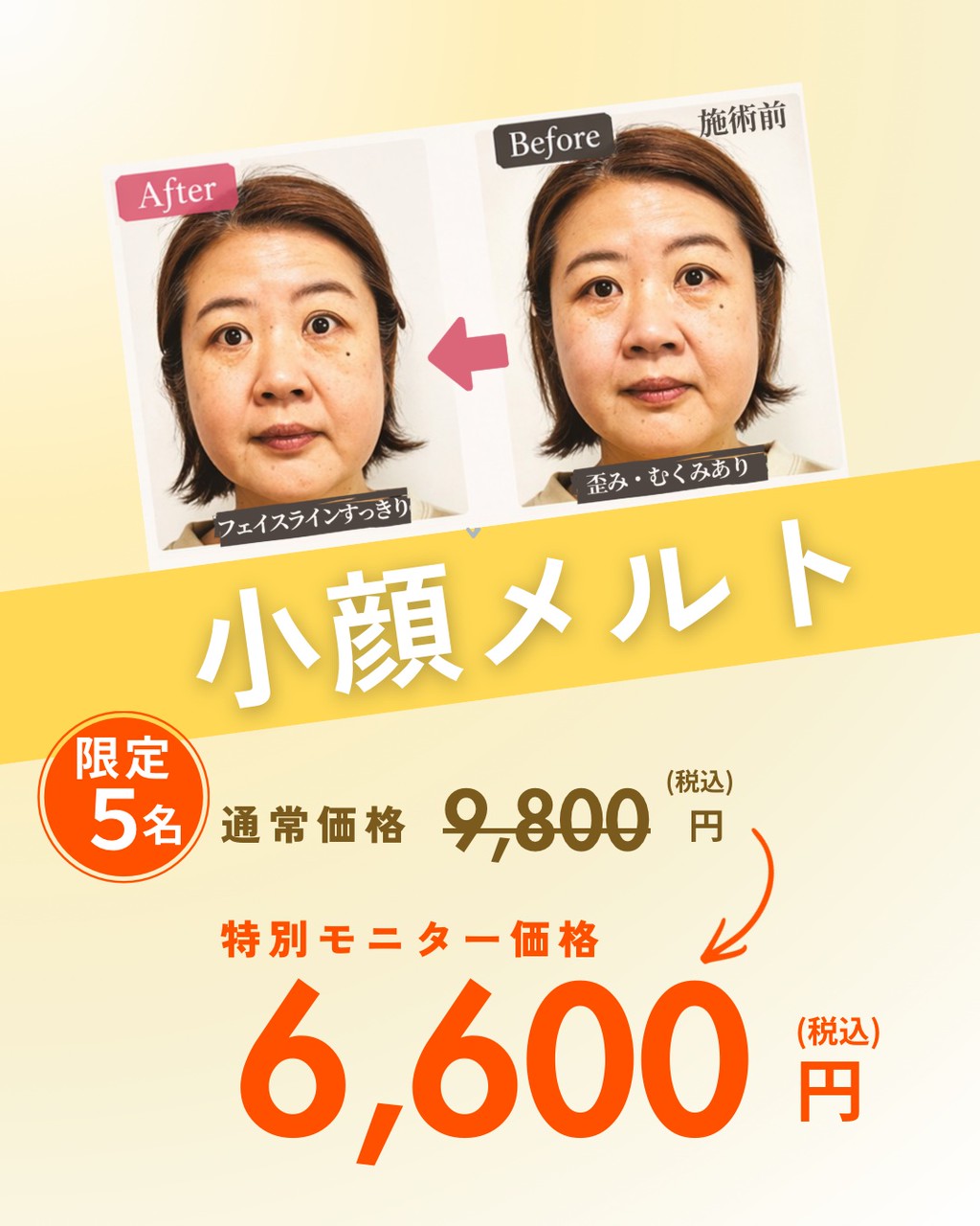 \小顔メルト モニター募集/本日スタートします.✨限定5名 9800円→6600円 blog 2026.04.28 【予約受付スタート】 小顔メルトモニター募集スタートしました✨ ーーーーーーーーーー ■5/10(日)〜5/31(日)■先着5名様限定(アンケートに答えてくれる方)■モニター価格:¥6,600 公式アカウント ▼ご予約は LINE公式アカウントよりメニュー→ご予約はこちらから→小顔メルトモニター募集をお選びください ーーーーー\小顔メルト モニター募集/本日スタートします✨ーーーーー ※先着順のため埋まり次第終了となります すでに埋まり始めていますのでご希望の方はお早めに😊